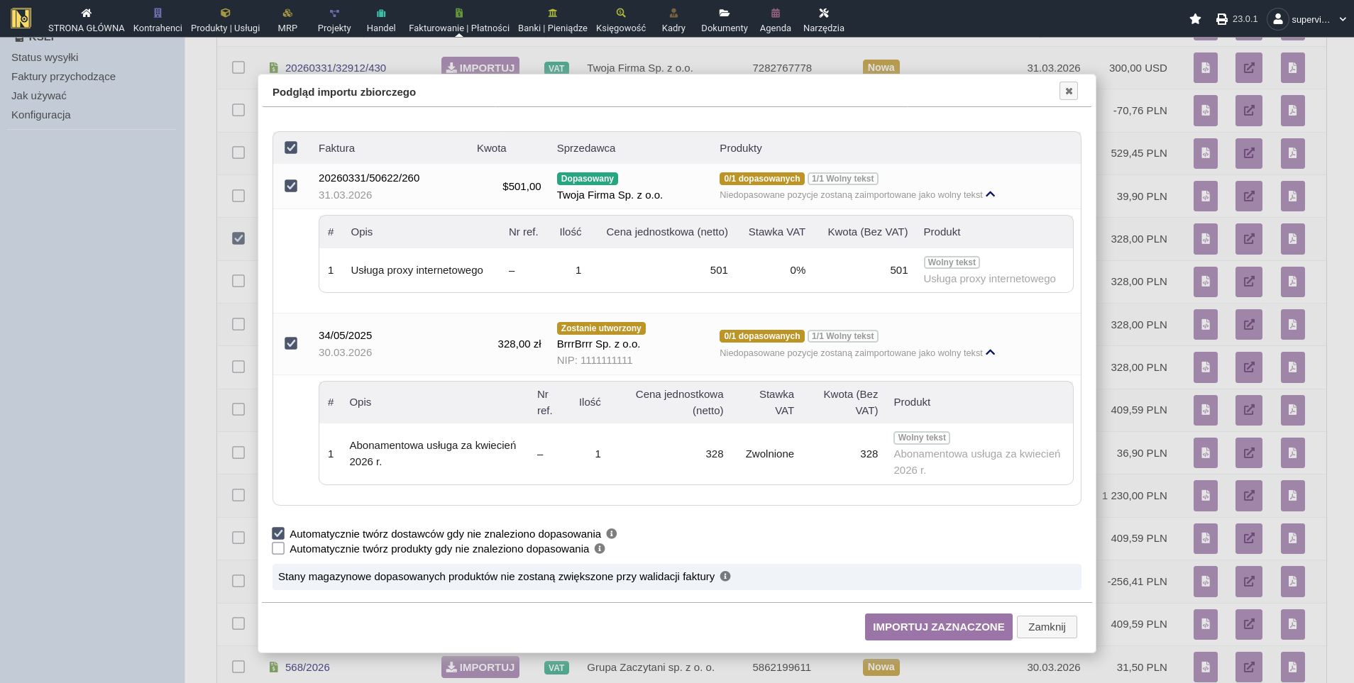 1. Na liście faktur przychodzących zaznacz faktury, które chcesz zaimportować, za pomocą pól wyboru