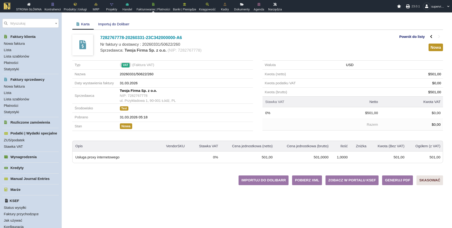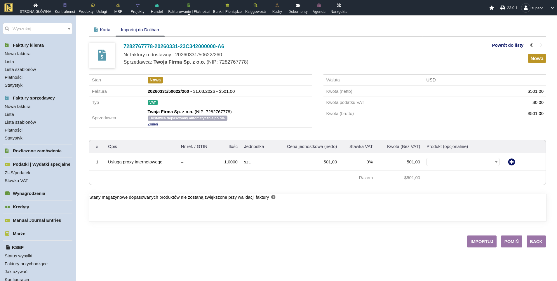 Zaimportowana - pomyślnie zaimportowana jako faktura dostawcy w Dolibarr