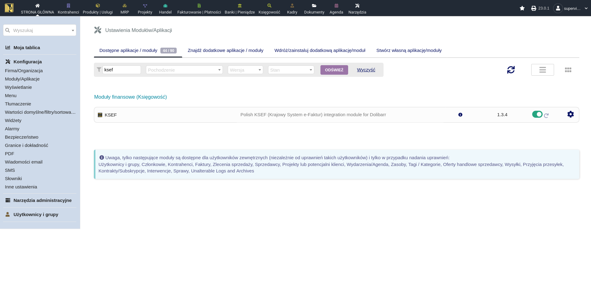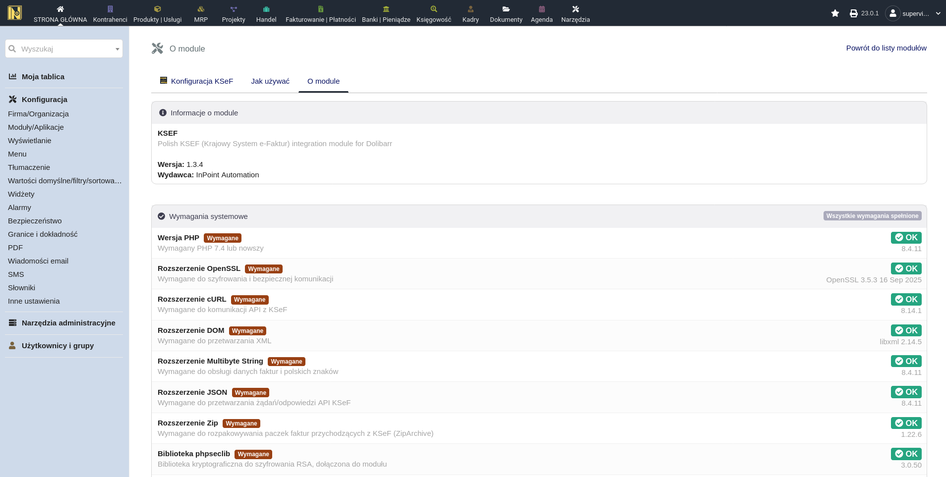 Przed instalacją modułu KSeF upewnij się, że następujące moduły Dolibarr są włączone (Strona główna -> Ustawienia -> Moduły/Aplikacje):