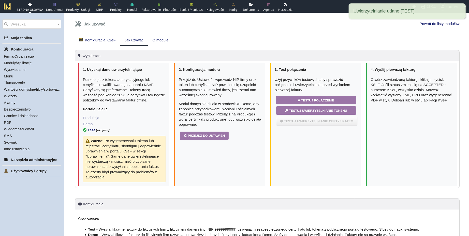5. Wyskakujące okno potwierdzi sukces, a moduł KSeF pojawi się na liście modułów