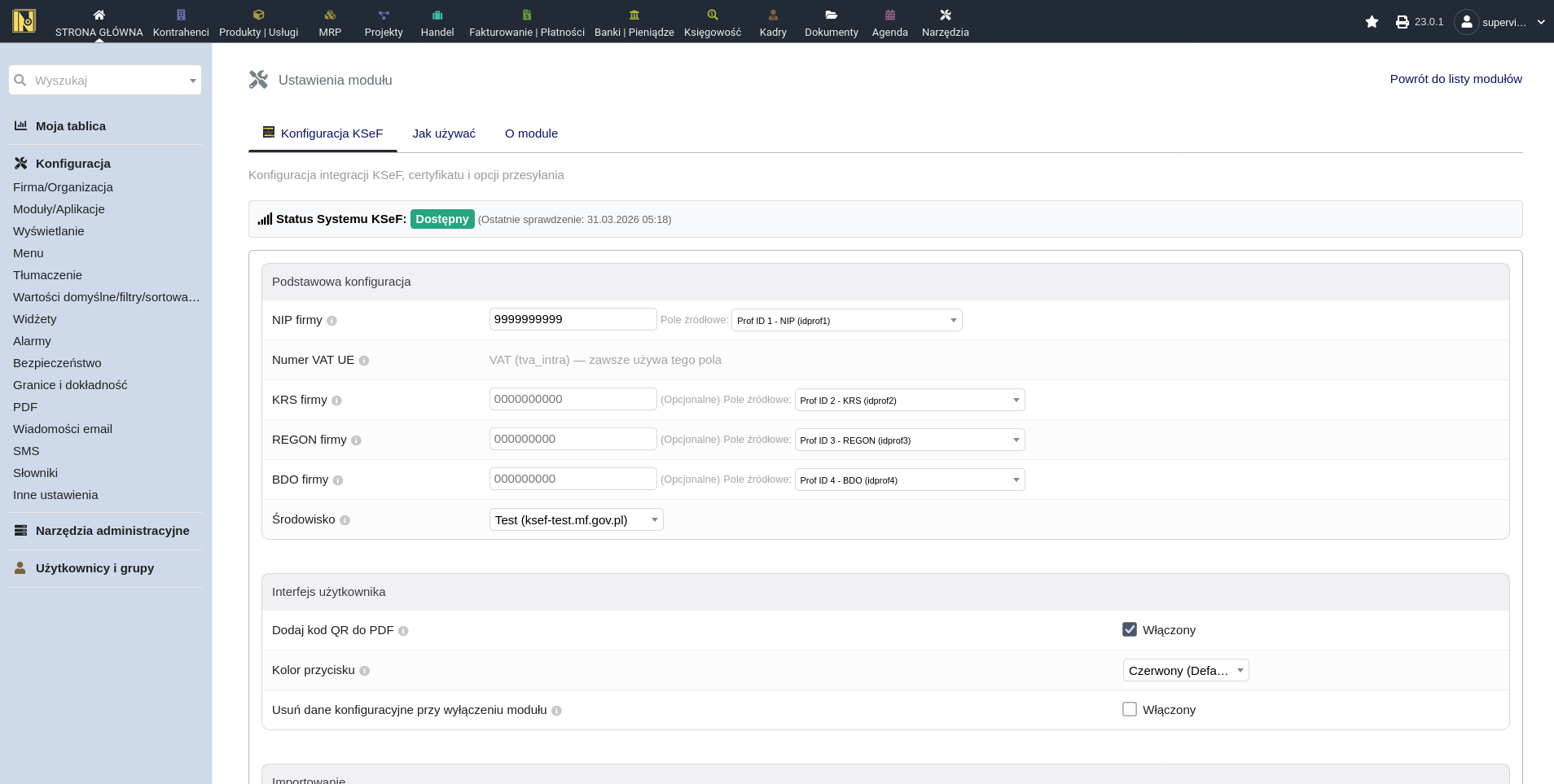 Konfiguracja modułu (ustawienia/tokeny/certyfikaty) jest zawsze ograniczona do użytkowników z uprawnieniami administratora. Jeśli masz wielu użytkowników, przypisz uprawnienia KSeF po włączeniu modułu, ponieważ nowe uprawnienia nie są automatycznie nadawane istniejącym użytkownikom.