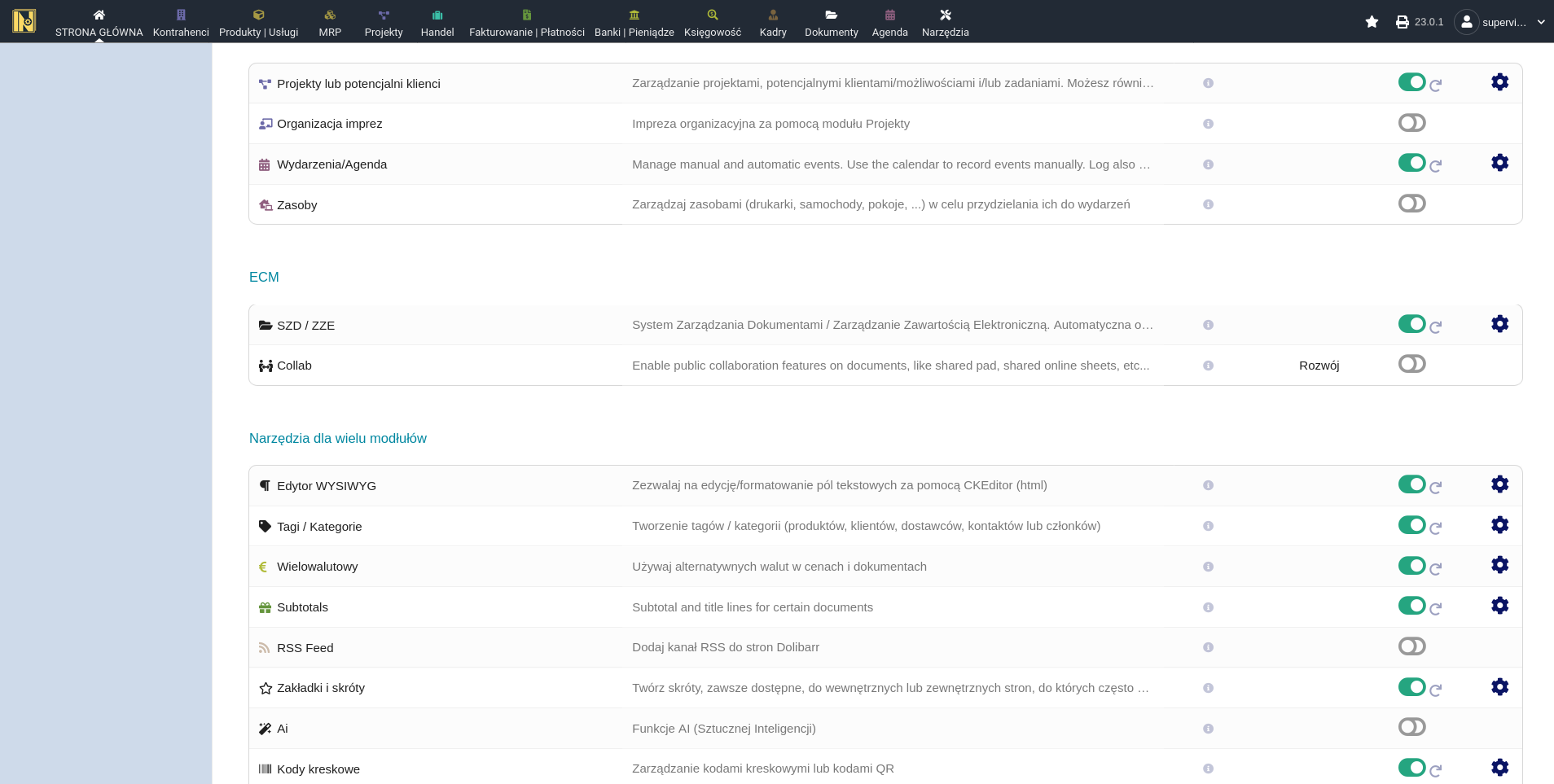 Włącz wymagane moduły Dolibarr