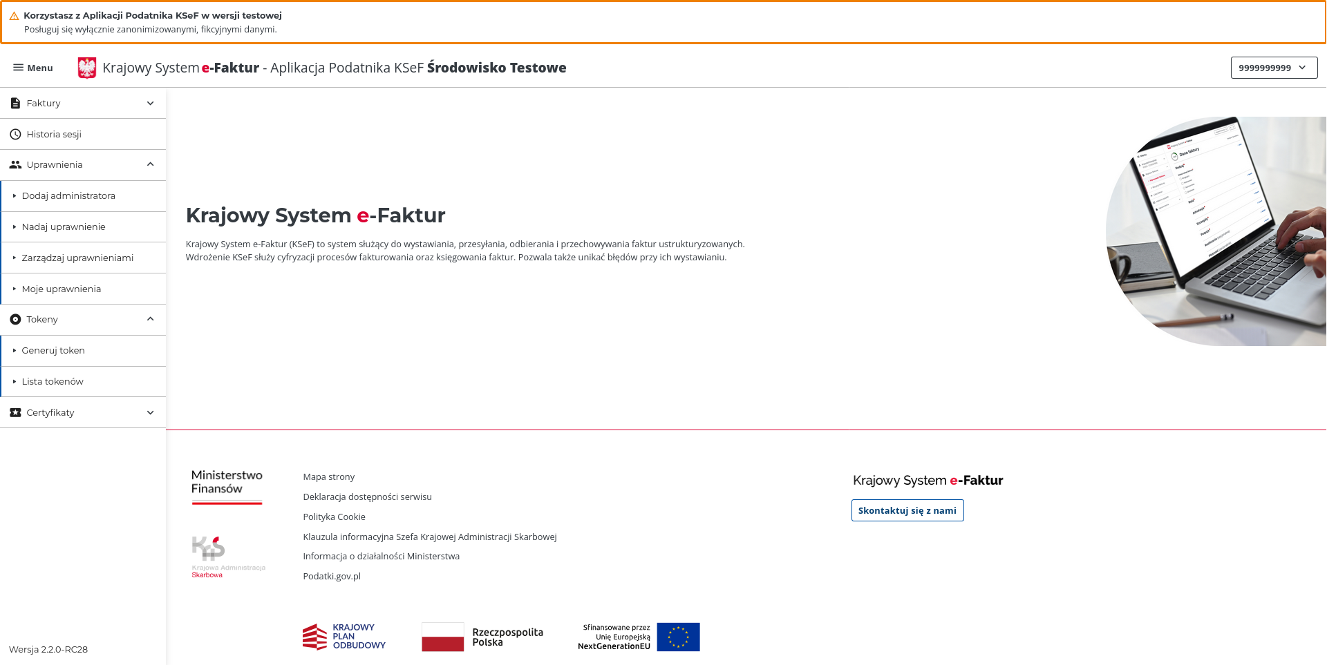 Test - do nauki systemu - używasz fikcyjnych danych firmy, logujesz się bez specjalnych poświadczeń i wysyłasz fikcyjne faktury. Faktury nie mają znaczenia prawnego