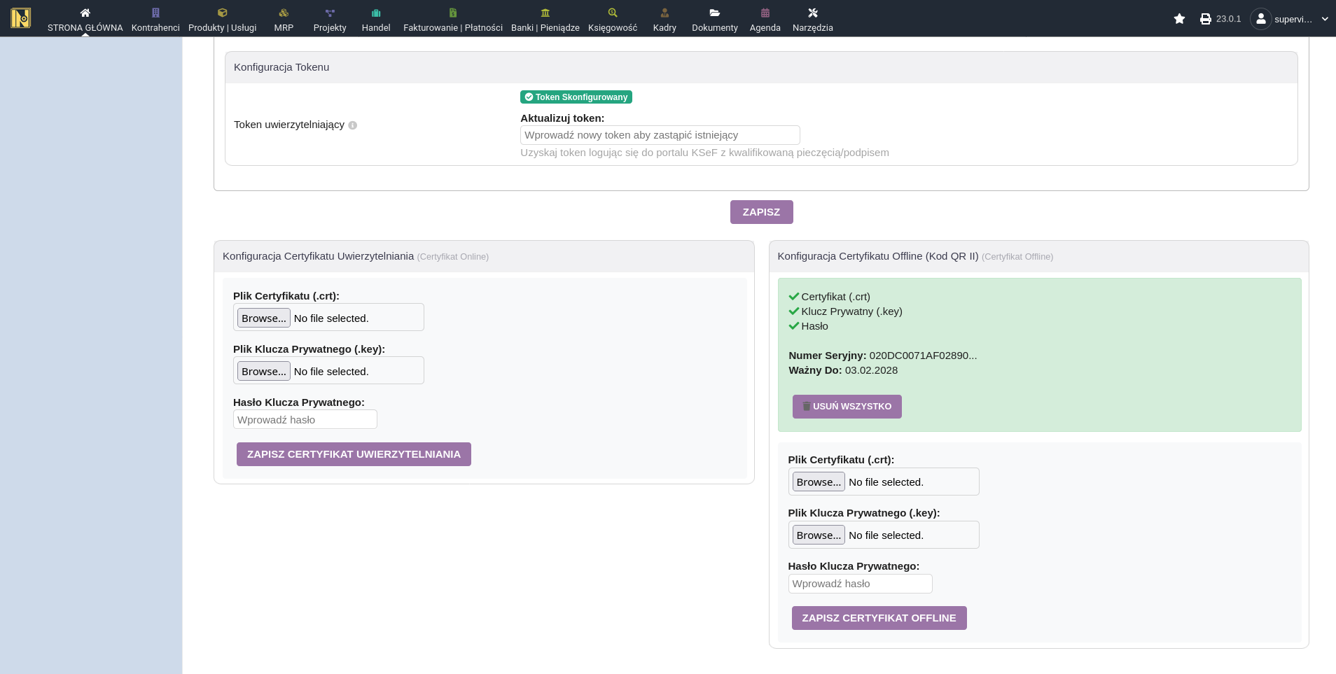 Konfiguracja certyfikatu - prześlij certyfikat (plik .crt) i klucz prywatny (plik .key), podaj hasło, a następnie kliknij zapisz. Rób to krok po kroku. W przypadku problemu wyjaśnienie pojawi się w oknie dialogowym. Możliwe jest też przypadkowe przesłanie certyfikatu offline zamiast online i odwrotnie, więc jeśli dostęp do KSeF zwraca błąd o nieprawidłowym typie certyfikatu, to prawdopodobnie właśnie to się stało.