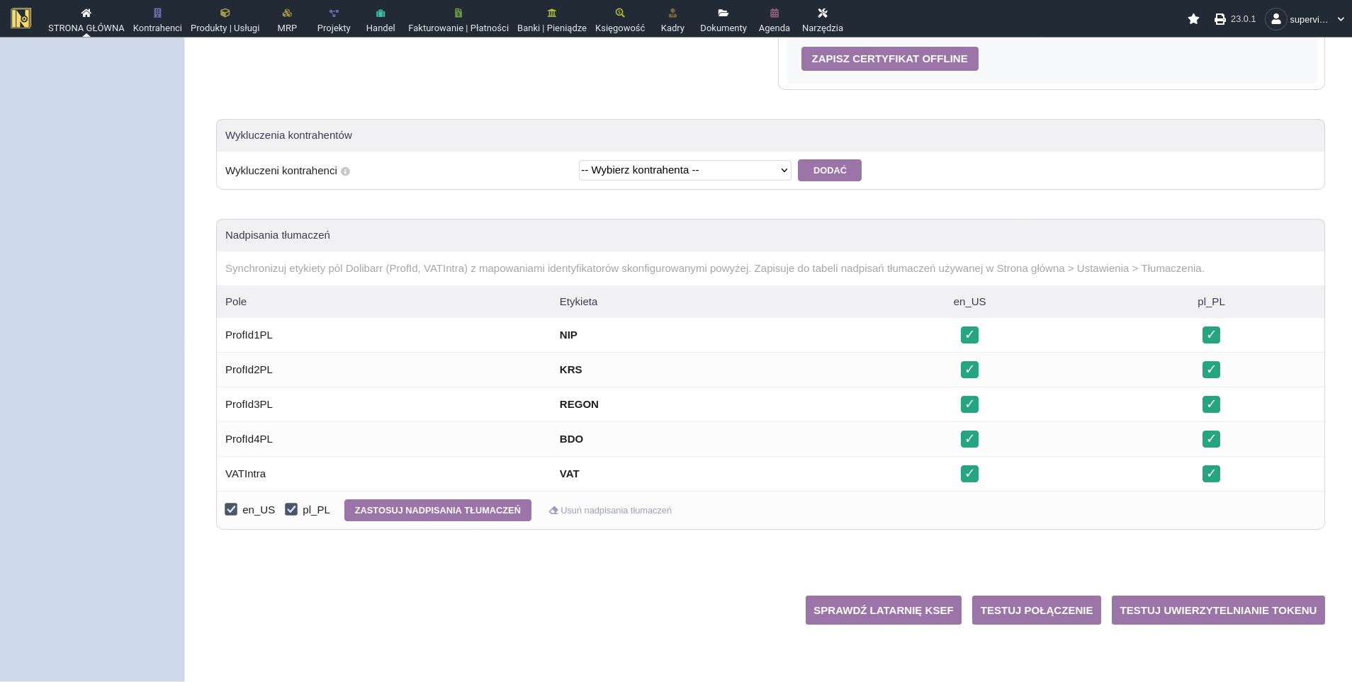 Domyślnie Dolibarr nie wyświetla wszystkich pól identyfikacyjnych. Moduł może nadpisać te tłumaczenia, aby NIP, KRS, REGON i BDO wyświetlały się poprawnie na kartach kontrahentów i w całym interfejsie, co ułatwia zachowanie spójności. Robi to poprzez aktualizację tabel nadpisań tłumaczeń na podstawie konfiguracji pól źródłowych na górze strony.
